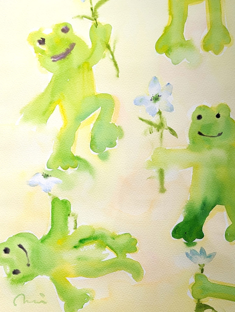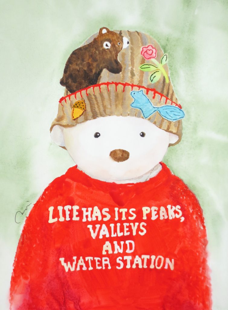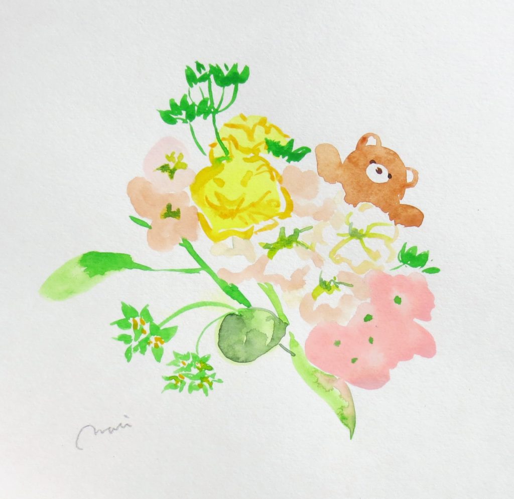 I lost count of how many pictures I painted, trying out different angles and colors. Finally, when I captured the free and graceful leaves and stems the beautiful colors, and the perfect flowers I had envisioned, a little bear pretending to be a flower fairy peeked out from between the blooms and said, “Hi!”