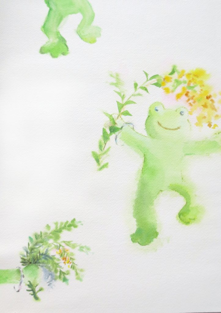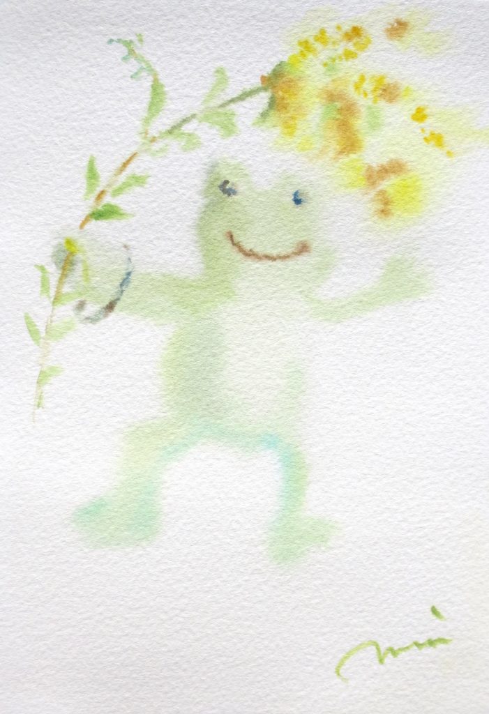 My own contribution is titled “Dancing with Flowers — Mimosa”, a spring-inspired piece featuring a frog mid-dance, guided by a cloud of golden mimosa blossoms. It’s whimsical, but also about renewal and presence — and yes, maybe a little strange in just the right way.